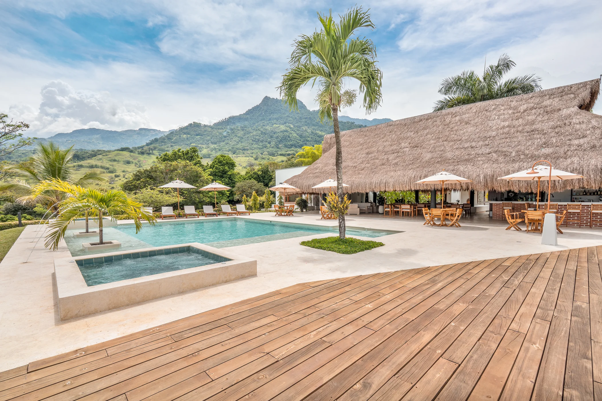 Nuestro Patio es un lugar perfecto para relajarse, refrescarse y descansar con una vista espectacular y rodeado de mucha naturaleza. Tiene diversas plantas y árboles, Piscina al aire libre con hidromasajes de agua fría, 2 Baños de Hidromasajes con calefacción, Deck, sillas de sol y mesas con sombrilla.