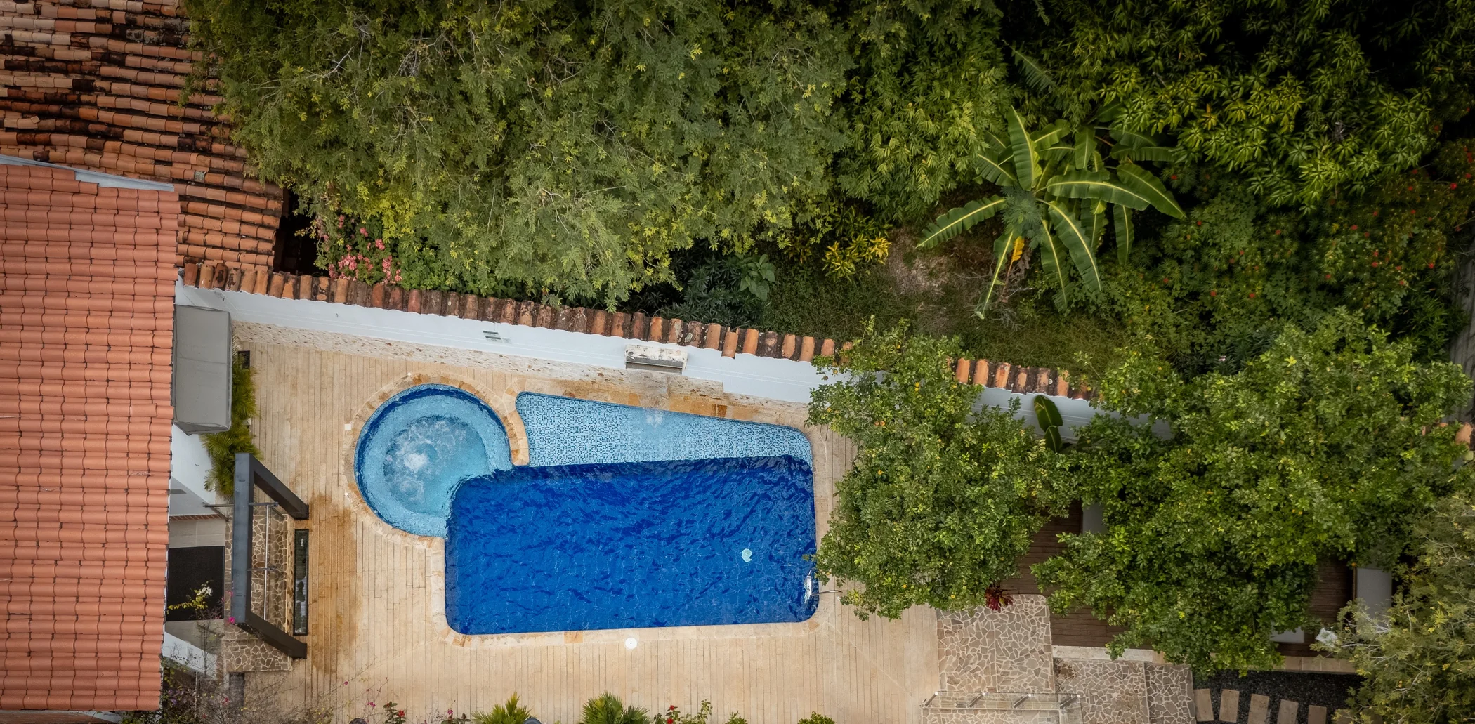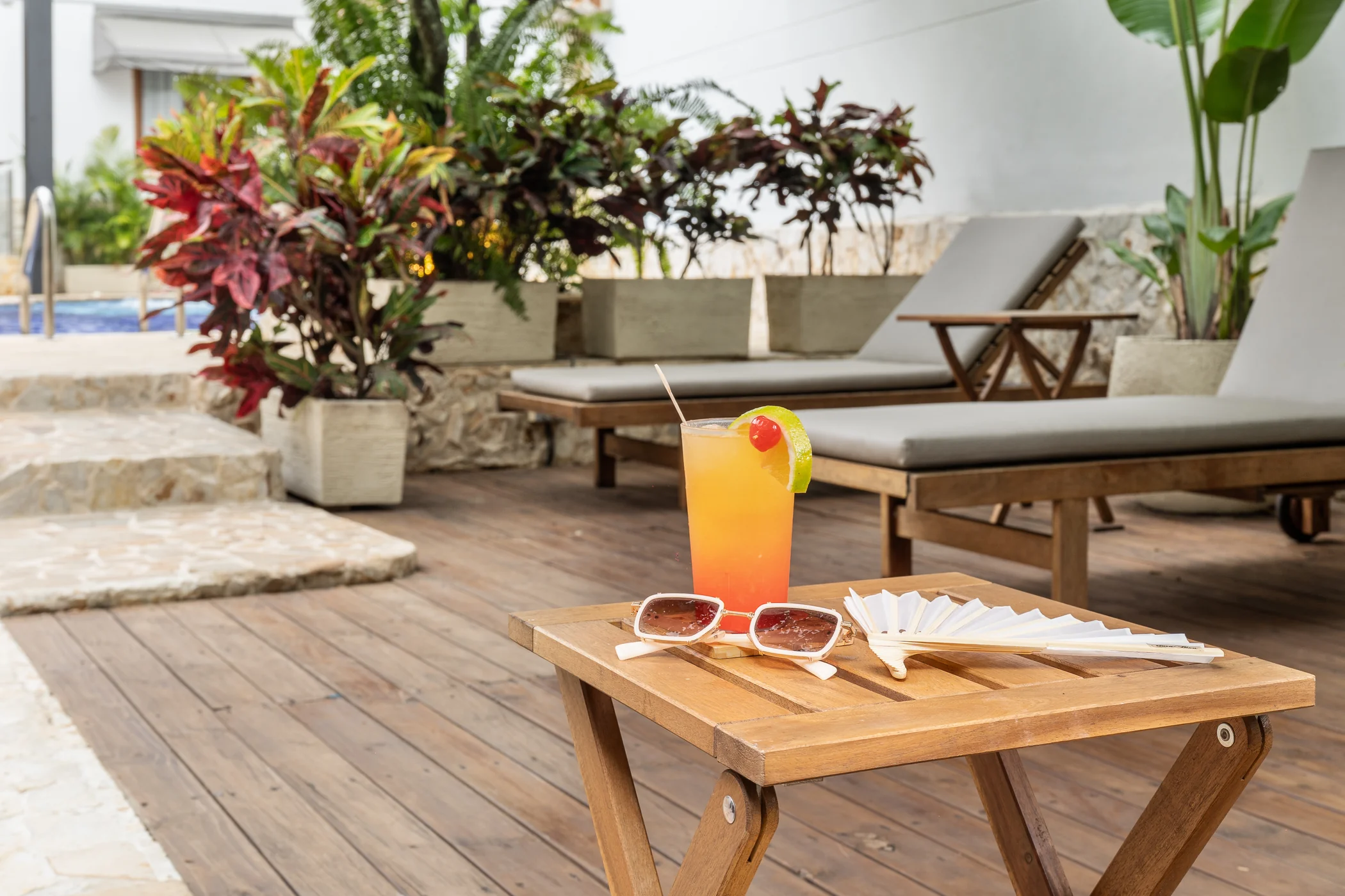 Descansa en nuestro patio al aire libre, exclusivo para huéspedes, con Piscina , Baño de Hidromasajes, Pérgolas, Sillas Asoleadoras y Tiki Bar con refrescantes Bebidas y Cocteles.