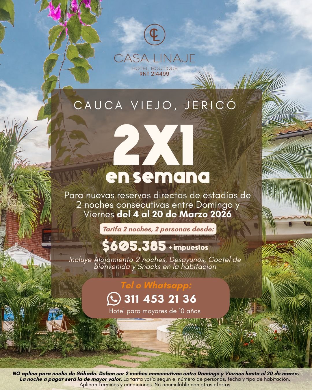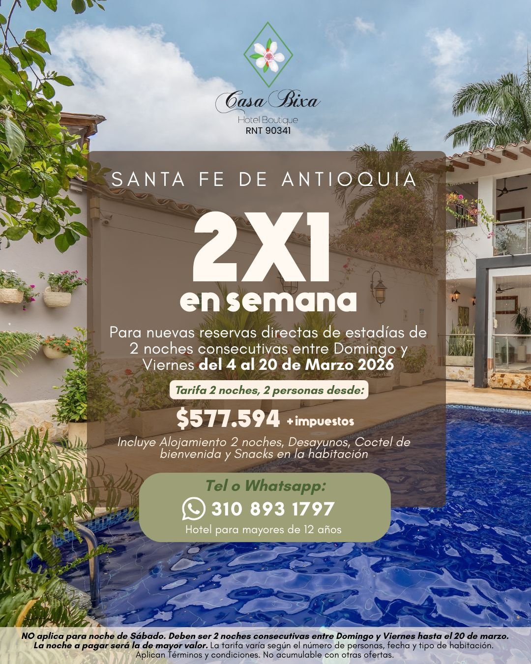 NOTA; Solo aplica para 2 noches consecutivas entre Domingo y Jueves (sin festivos). Este plan NO aplica para fines de semana, semana santa ni la semana de receso. Válido hasta el 30 d noviembre 2025.